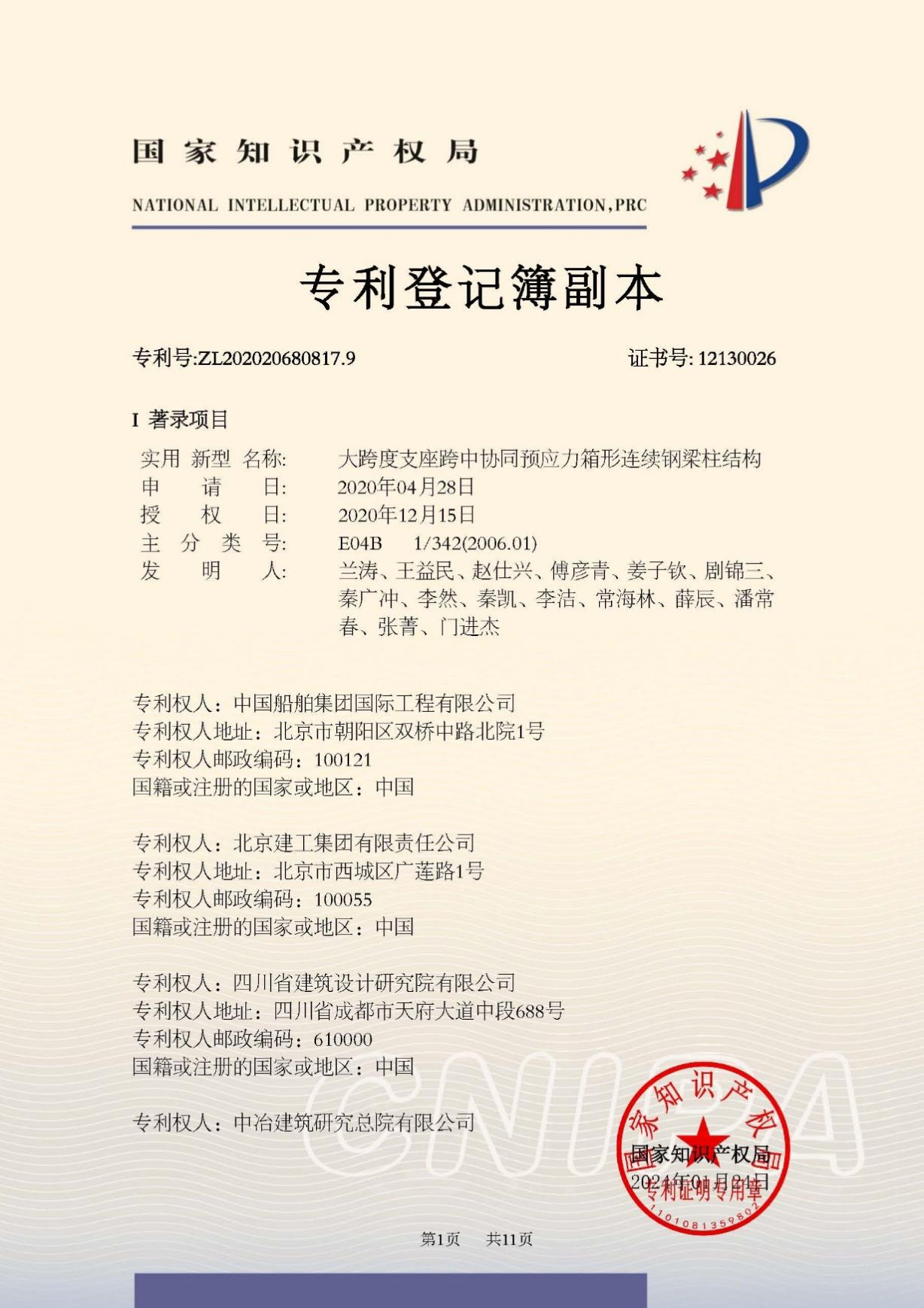 今年6月,國家知識(shí)產(chǎn)權(quán)局公布第二十五屆中國專利獎(jiǎng)授獎(jiǎng)決定,由中船集團(tuán)旗下中船國際工程主導(dǎo)申報(bào)的專利《大跨度支座跨中協(xié)同預(yù)應(yīng)力箱形連續(xù)鋼梁柱結(jié)構(gòu)》(專利號(hào):ZL202020680817.9)榮獲本屆中國專利銀獎(jiǎng)。該獎(jiǎng)項(xiàng)由國家知識(shí)產(chǎn)權(quán)局與世界知識(shí)產(chǎn)權(quán)組織聯(lián)合設(shè)立,是我國專利領(lǐng)域的最高榮譽(yù)。今天,讓我們走進(jìn)中船國際工程鋼結(jié)構(gòu)工程設(shè)計(jì)與研發(fā)團(tuán)隊(duì),聆聽他們的奮斗故事。