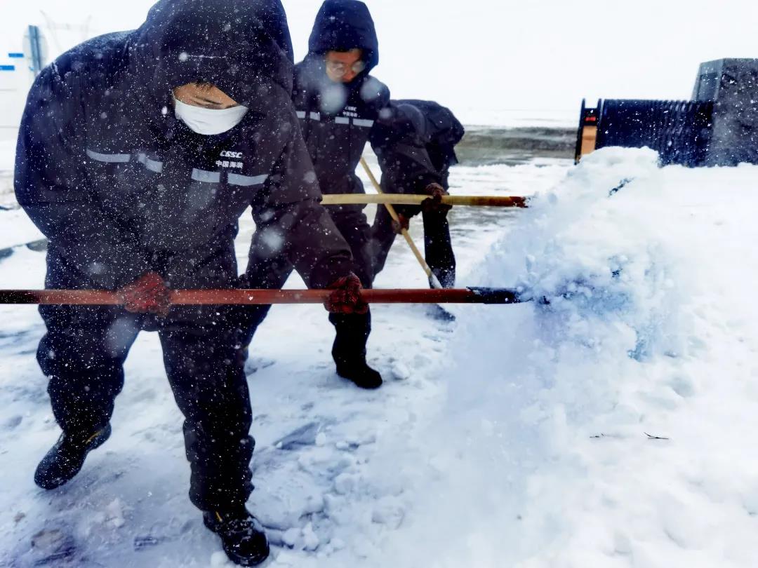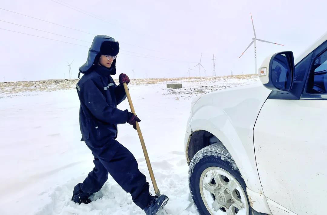 進(jìn)入11月,內(nèi)蒙古自治區(qū)錫林郭勒盟地區(qū)迎來大面積的暴風(fēng)雪,烏達(dá)萊項目人員在趕往風(fēng)場的路上遭遇積雪路段,雖然氣候嚴(yán)寒,但為了及時消除機(jī)組故障,大家在積雪路段采取挖雪推車的方式齊心協(xié)力,一同開展清理路面積雪的行動。這個冬日,冰雪阻擋不住海裝追風(fēng)者們勇往直前的步伐,他們只為恪盡職守完成一個承諾——風(fēng)機(jī)旋轉(zhuǎn)、帶來光熱。