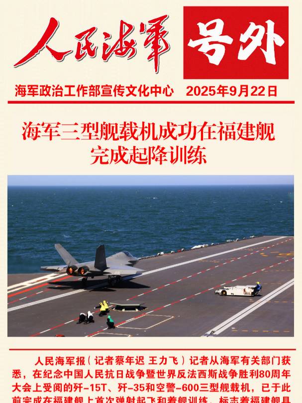 記者從海軍有關(guān)部門獲悉,在紀(jì)念中國(guó)人民抗日戰(zhàn)爭(zhēng)暨世界反法西斯戰(zhàn)爭(zhēng)勝利80周年大會(huì)上受閱的殲-15T、殲-35和空警-600三型艦載機(jī),已于此前完成在福建艦上首次彈射起飛和著艦訓(xùn)練,標(biāo)志著福建艦具備了電磁彈射和回收能力。這是我國(guó)航母發(fā)展歷程中取得的又一次突破,對(duì)推進(jìn)海軍轉(zhuǎn)型建設(shè)具有里程碑意義。