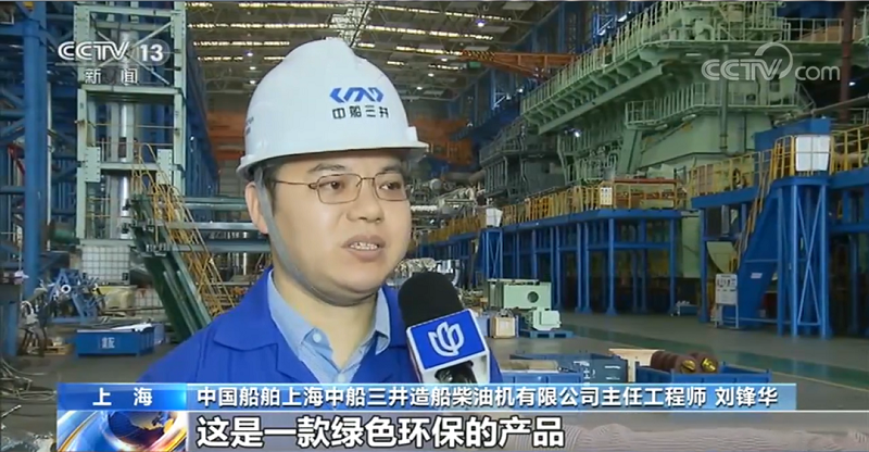 ????中國船舶上海中船三井造船柴油機有限公司主任工程師 劉鋒華:尺寸最大,達到了5層樓那么高,功率達到了63800多千瓦,功率也是最大的。這是一款綠色環(huán)保的產(chǎn)品,使用燃?xì)膺\行時氮氧化物的排放不到常規(guī)發(fā)動機的十分之一,硫氧化物和顆粒物的排放也是非常好的,不用裝任何后處理設(shè)備,都可以滿足IMO(國際海事組織)最新的排放法規(guī)要求。
