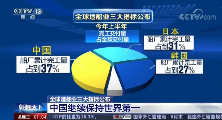 全球權威航運造船機構公布的最新數據顯示,今年上半年,全球造船業(yè)三大指標,中國再次領先,繼續(xù)保持世界第一的紀錄。