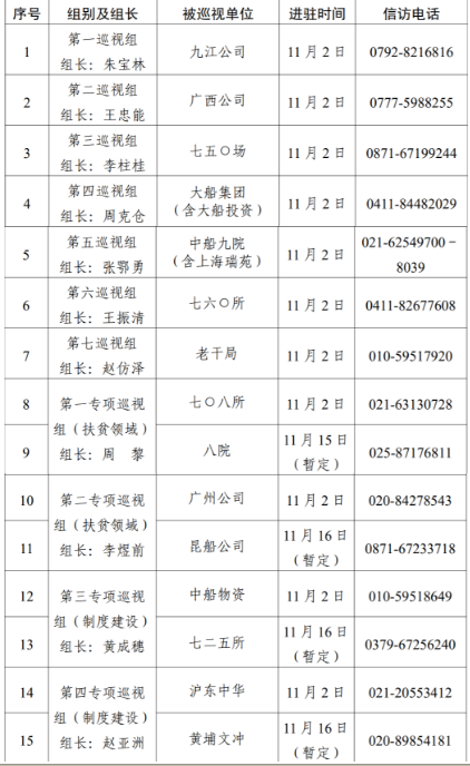 根據(jù)中國(guó)船舶集團(tuán)黨組對(duì)2020年第二輪巡視工作的統(tǒng)一部署,截止11月2日,集團(tuán)公司黨組7個(gè)常規(guī)巡視組已全部完成進(jìn)駐,對(duì)九江公司、廣西公司、七五〇場(chǎng)、大船集團(tuán)(含大船投資)、中船九院(含上海瑞苑)、七六〇所、老干局等7家單位開展常規(guī)巡視。集團(tuán)公司黨組4個(gè)專項(xiàng)巡視組采取“一托二”方式同步對(duì)七〇八所、八院、廣州公司、昆船公司、中船物資、七二五所、滬東中華、黃埔文沖等8家單位開展扶貧領(lǐng)域、制度建設(shè)專項(xiàng)巡視,4個(gè)專項(xiàng)巡視組目前均已進(jìn)駐首家被巡視單位。