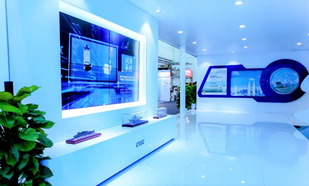 中國(guó)船舶集團(tuán)展臺(tái)摒棄了“傳統(tǒng)色彩矩陣”,用“深海藍(lán)”加 “風(fēng)機(jī)白”打造出大氣磅礴的開(kāi)合式復(fù)合空間域,細(xì)節(jié)上則采用生態(tài)為先、大道至簡(jiǎn)、科技為尚三大設(shè)計(jì)語(yǔ)言,將“風(fēng)傳送”“海推動(dòng)”“碳排放”業(yè)務(wù)生態(tài)鏈條進(jìn)行了全方位的解構(gòu),吸引了眾多觀展人士駐足。