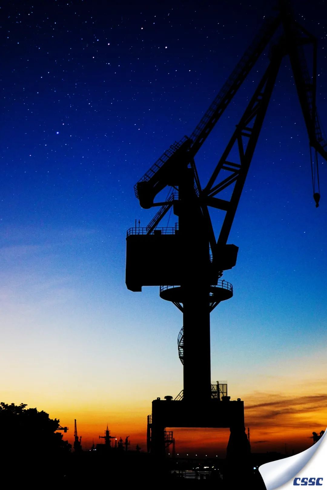 雖與巨輪不同,但船舶生產(chǎn)場(chǎng)地的起重器械亦可稱大國(guó)重器。此圖拍攝于2022年2月11日黃埔文沖,恰逢黃昏與星夜交替,器械與船舶共舞。舉起相機(jī)對(duì)著夕陽(yáng),記錄下這美好的時(shí)刻,以剪影的形式表現(xiàn)工作中的船舶風(fēng)景。