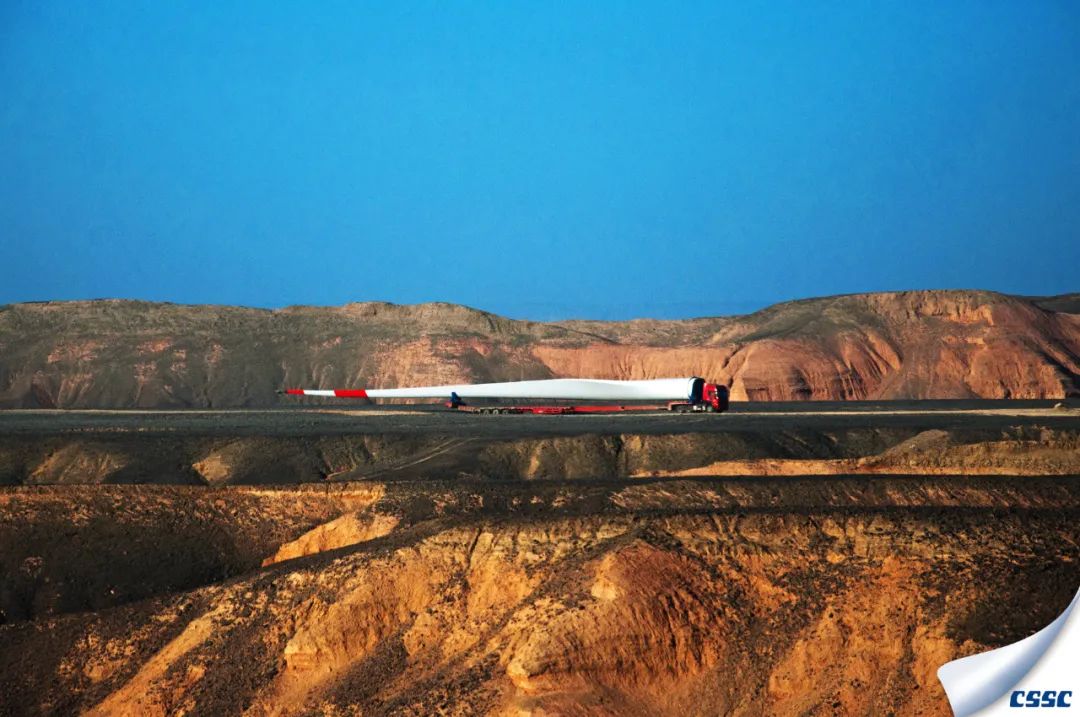 虎年開年, 中國(guó)海裝首臺(tái)H155-5MW機(jī)組在百里風(fēng)區(qū)——新疆哈密成功完成吊裝,該機(jī)組是新疆哈密目前單機(jī)容量最大的風(fēng)電機(jī)組。圖為超大型風(fēng)葉運(yùn)輸過(guò)程的縮影。