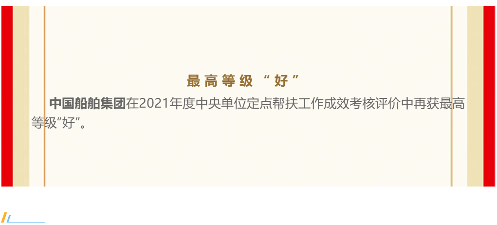 近日,中國(guó)船舶集團(tuán)在2021年度中央單位定點(diǎn)幫扶工作成效考核評(píng)價(jià)中再獲最高等級(jí)“好”。這是自2019年組建成立以來,中國(guó)船舶集團(tuán)連續(xù)第三年獲“好”。