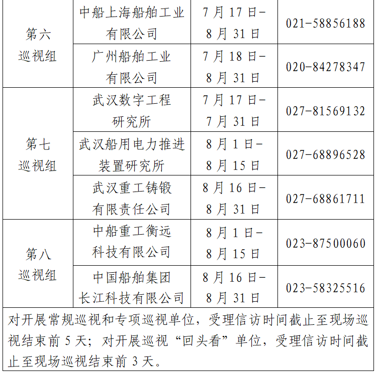 根據(jù)中國船舶集團(tuán)黨組2023年第一輪巡視工作部署,截至2023年7月17日,巡視工作已經(jīng)鋪開。其中,對中國船舶工業(yè)貿(mào)易有限公司、中國船舶集團(tuán)物資有限公司、江蘇自動化研究所、河南柴油機(jī)重工有限責(zé)任公司、中國船舶集團(tuán)有限公司綜合技術(shù)經(jīng)濟(jì)研究院、船舶信息研究中心、中國船舶集團(tuán)國際工程有限公司等7家單位開展常規(guī)巡視,對中船上海船舶工業(yè)有限公司、廣州船舶工業(yè)有限公司等2家單位開展專項巡視,對武漢數(shù)字工程研究所、武漢船用電力推進(jìn)裝置研究所、武漢重工鑄鍛有限責(zé)任公司、中國船舶集團(tuán)長江科技有限公司、中船重工衡遠(yuǎn)科技有限公司等5家單位開展巡視“回頭看”。