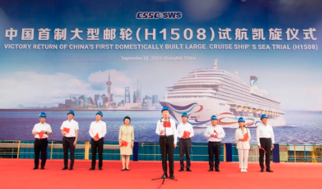 現場舉行了簡短的歡迎儀式。溫剛宣布中國首制大型郵輪完工試航所有驗證項目全部達標,試航任務圓滿完成。