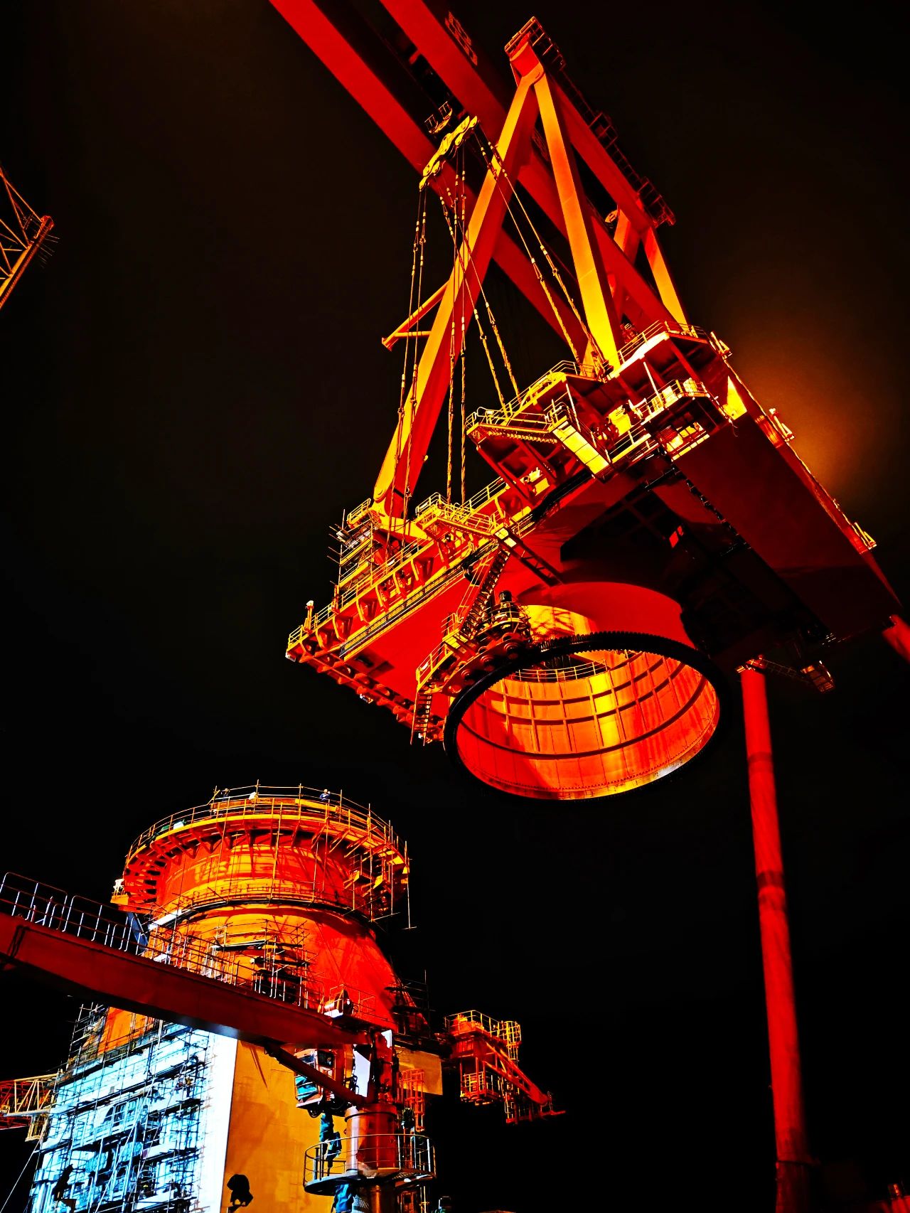在武漢船機平臺總裝現(xiàn)場,華夏金租神大平臺配套的1200噸起重機正在安裝,大件吊裝各項準備工作繁瑣,一切就緒時,天已經(jīng)黑了,現(xiàn)場一鼓作氣開始吊裝對接,展現(xiàn)了船舶人只爭朝夕、不負韶華、忘我工作精神風貌。