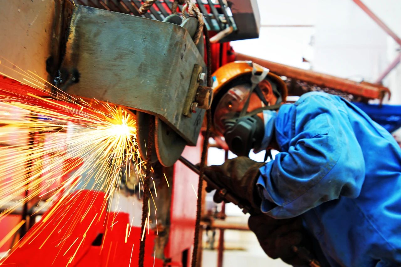 電焊工,就文沖修造最美的一線工人,他們從頭到腳“全副武裝”,一副墨鏡,一個(gè)面罩,一套包裹的嚴(yán)嚴(yán)實(shí)實(shí)的工作服是他們的色調(diào)。此起彼伏吱吱作響的燒焊聲,黃紅藍(lán)色的焊花,伴著刺眼的弧光,如噴泉一般是他們奏響的樂章。