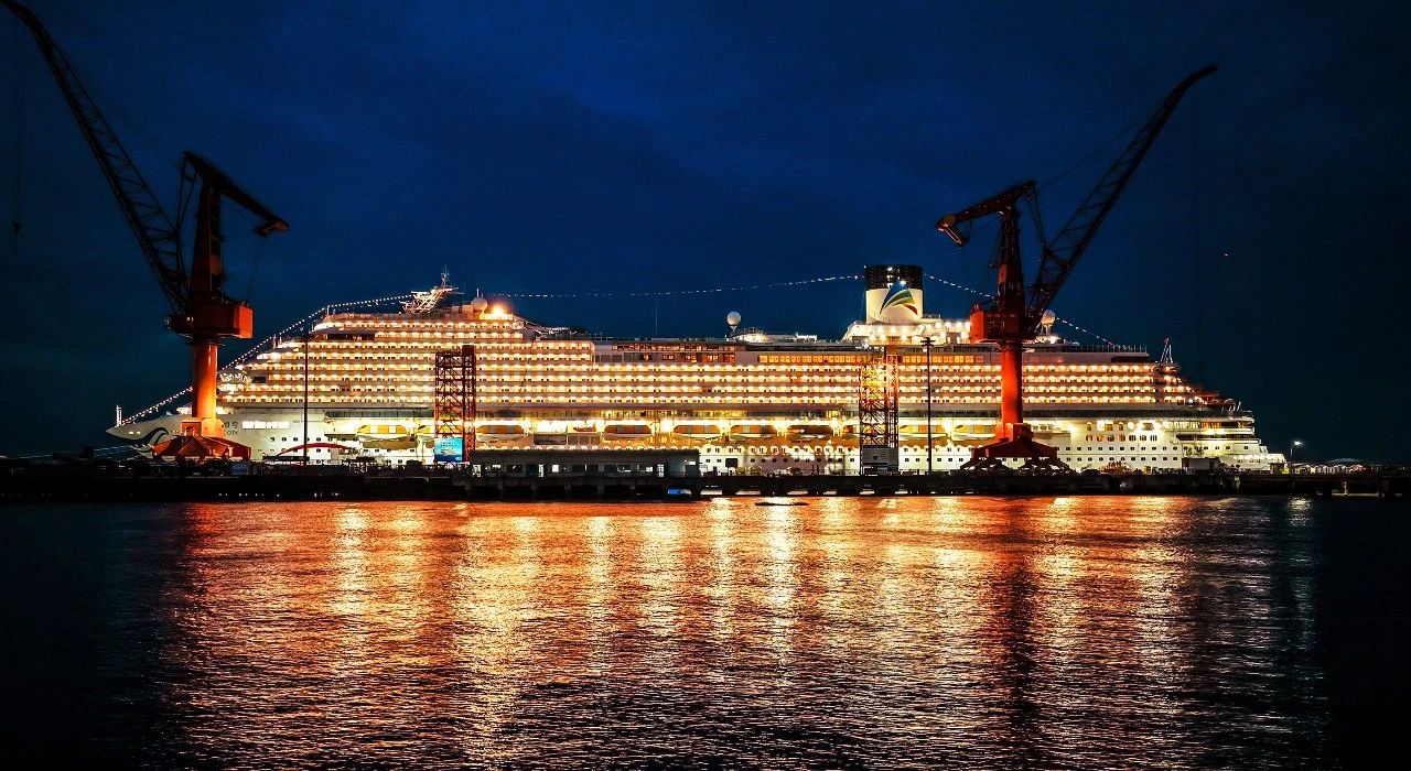 國產(chǎn)首艘國產(chǎn)大型郵輪“愛達(dá)·魔都號(hào)”,??吭陂L江口,燈光電路測試期間,華燈綻放恍如白晝。