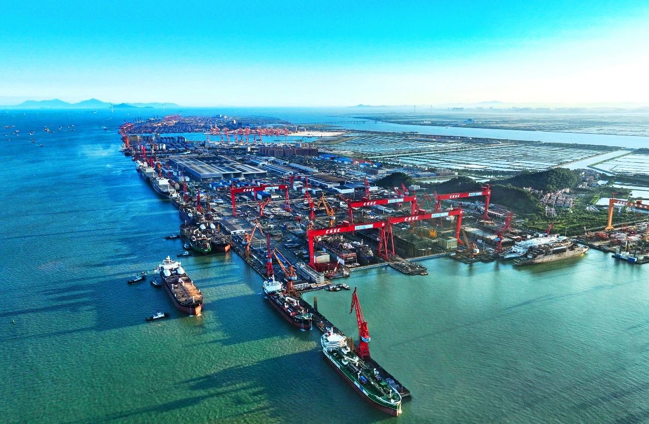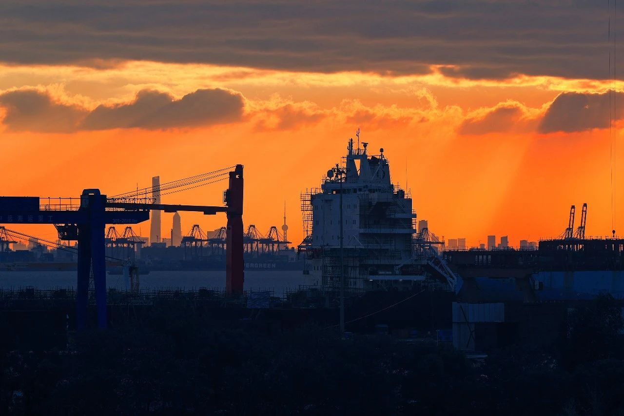 落日余暉下,造船現(xiàn)場燈火通明,展現(xiàn)出一派繁忙景象。在五彩斑斕的晚霞襯托下,整個(gè)造船基地猶如寶石般熠熠生輝。