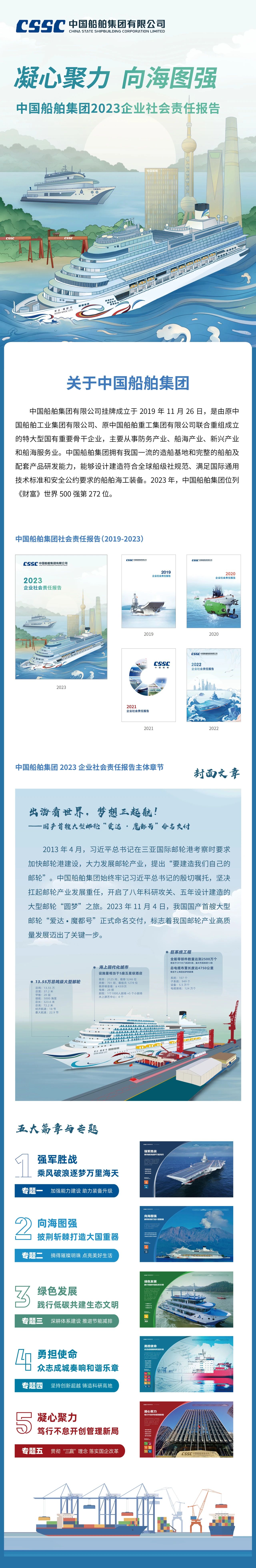 近日,中國(guó)船舶集團(tuán)有限公司發(fā)布了《2023企業(yè)社會(huì)責(zé)任報(bào)告》(以下簡(jiǎn)稱《報(bào)告》)。本報(bào)告是中國(guó)船舶集團(tuán)正式發(fā)布的第五份企業(yè)社會(huì)責(zé)任報(bào)告。