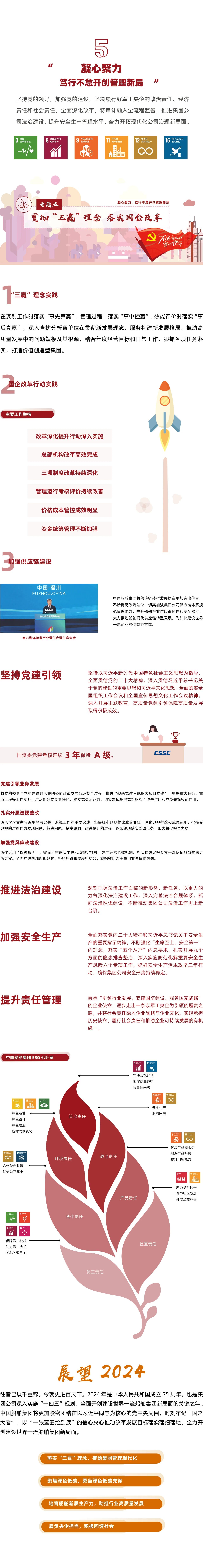 《報(bào)告》講述了中國(guó)船舶集團(tuán)貫徹新發(fā)展理念,堅(jiān)持價(jià)值創(chuàng)造,發(fā)展壯大主業(yè)實(shí)業(yè),增強(qiáng)經(jīng)營(yíng)管理能力,加快深化改革,建設(shè)世界一流船舶集團(tuán)的成績(jī)。主體章節(jié)圍繞“強(qiáng)軍勝戰(zhàn),乘風(fēng)破浪逐夢(mèng)萬(wàn)里海天”“向海圖強(qiáng),披荊斬棘打造大國(guó)重器”“綠色發(fā)展,踐行低碳共建生態(tài)文明”“勇?lián)姑?,眾志成城奏響和諧樂(lè)章”“凝心聚力,篤行不怠開(kāi)創(chuàng)管理新局”五個(gè)方面全面展示了中國(guó)船舶集團(tuán)履行政治責(zé)任、經(jīng)濟(jì)責(zé)任、環(huán)境責(zé)任、社會(huì)責(zé)任的實(shí)踐成效。