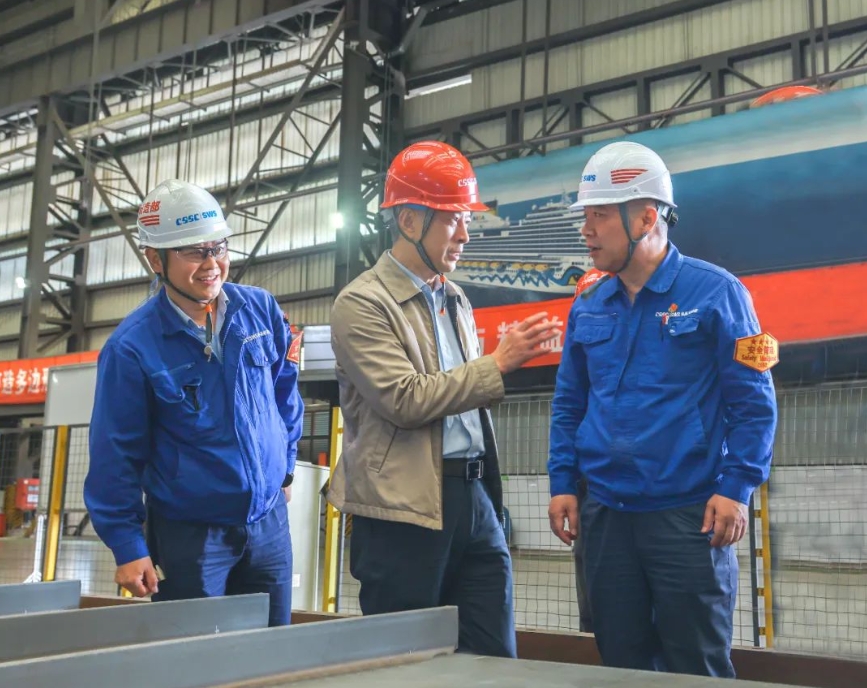 在相關(guān)二級管理單位,徐鵬調(diào)研了相關(guān)重點實驗室、車間和在建的國產(chǎn)大型郵輪“愛達(dá)·花城號”,與一線職工深入交流,并聽取了單位負(fù)責(zé)人關(guān)于經(jīng)營生產(chǎn)、公司治理、深化改革、隊伍建設(shè)、黨的建設(shè)等方面情況匯報。