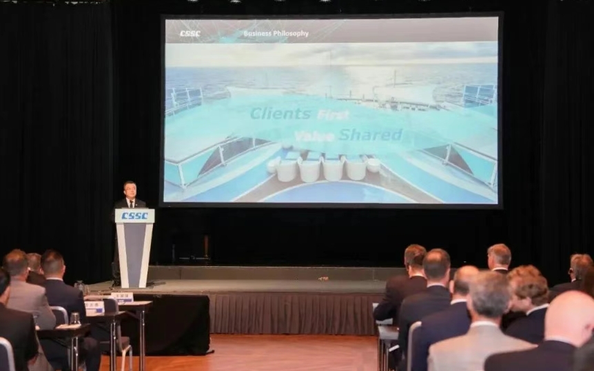 王國強(qiáng)向全球主要船東和合作伙伴宣講了“中船集團(tuán) 智領(lǐng)深藍(lán)”的企業(yè)品牌理念,闡述了中船集團(tuán)未來十年的“高端化、綠色化、智能化、共享化”戰(zhàn)略規(guī)劃方向,以及與全球廣大船東用戶“開放合作、共創(chuàng)共贏”的經(jīng)營理念。他強(qiáng)調(diào),作為全球船舶市場綠色低碳發(fā)展的引領(lǐng)者、踐行者和先行者,中船集團(tuán)始終堅(jiān)持創(chuàng)新驅(qū)動(dòng)的發(fā)展理念,以構(gòu)建海洋命運(yùn)共同體為使命,持續(xù)加快核心技術(shù)協(xié)同攻關(guān),不斷深化與全球航運(yùn)企業(yè)及國際海事界的多贏合作。