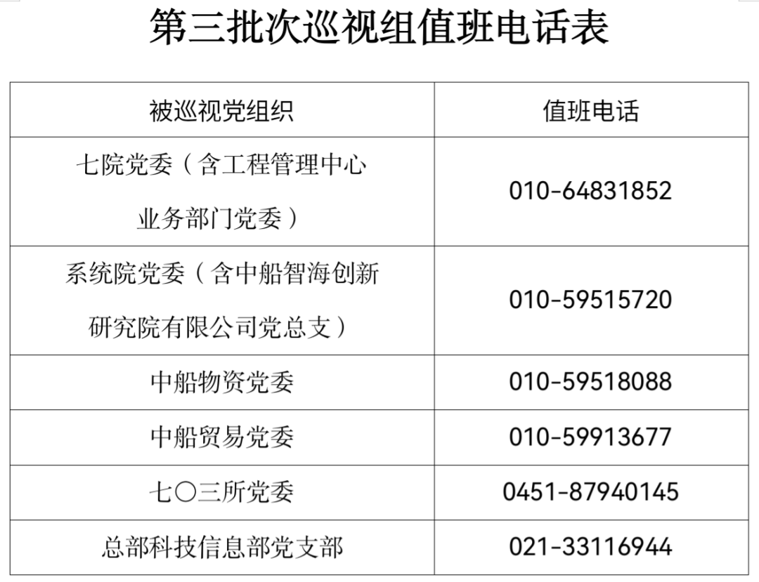 巡視期間,集團公司黨組巡視組設置值班電話和聯(lián)系信箱,主要受理反映被巡視黨組織領導班子及其成員、下一級黨組織領導班子主要負責人和重點崗位領導干部問題的來信、來電、來訪,重點關注違反政治紀律、組織紀律、廉潔紀律、群眾紀律、工作紀律、生活紀律以及巡視整改等方面問題反映。第三批次巡視受理信訪截止時間為9月22日。