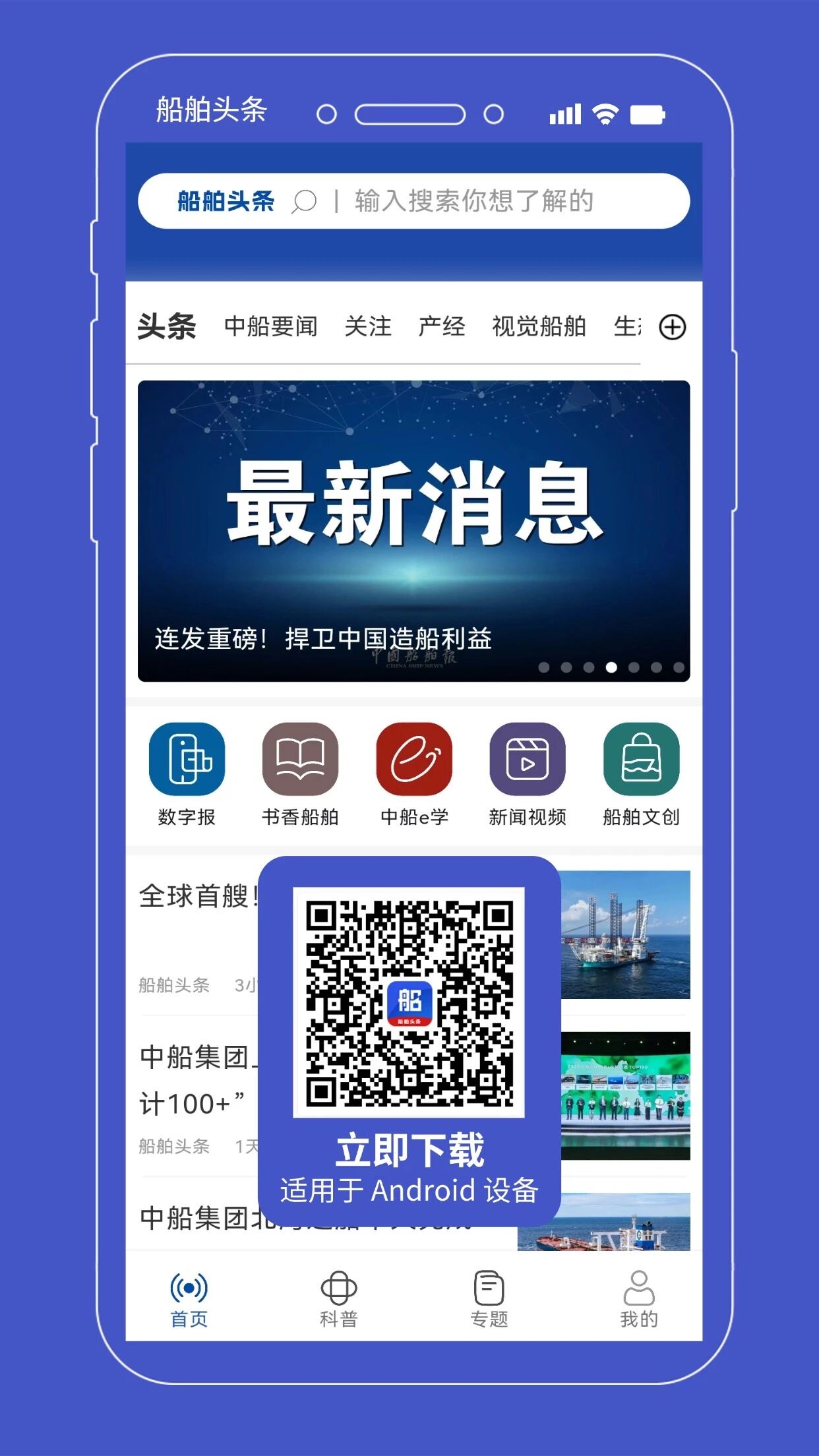 “船舶頭條”App聚焦海洋裝備產(chǎn)業(yè)鏈,集新聞發(fā)布、融合傳播、專業(yè)解讀、科普宣傳、企業(yè)智庫、服務(wù)聚合等功能為一體,設(shè)有“頭條”“中船要聞”“關(guān)注”“產(chǎn)經(jīng)”“視覺船舶”“生態(tài)圈”6個精品頻道以及“科普”“專題”等功能版塊,并鏈接“書香船舶”“《中國船舶報》數(shù)字報”“中船e學(xué)”“新聞視頻”“船舶文創(chuàng)”等多個服務(wù)端口,目前支持安卓系統(tǒng)下載使用。