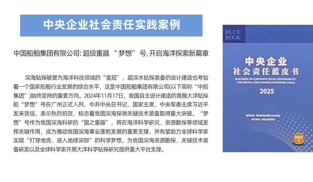 中船集團(tuán)申報(bào)的《超級重器“夢想”號,開啟海洋探索新篇章》,聚焦國之重器建造歷程,闡述了“夢想”號在海洋科學(xué)研究、深海資源勘探等領(lǐng)域的關(guān)鍵作用,成功入選《中央企業(yè)社會責(zé)任藍(lán)皮書(2025)》中央企業(yè)社會責(zé)任實(shí)踐案例。