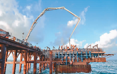 7月6日,隨著主橋23號墩承臺最后一車混凝土的澆筑,中國援馬爾代夫中馬友誼大橋5個主橋承臺全部施工完成,標(biāo)志著占全橋施工總量約70%的主橋部分從此徹底擺脫印度洋的強涌浪襲擾,進入上部結(jié)構(gòu)施工階段。
