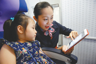 乘務(wù)員利用機(jī)上無(wú)線網(wǎng)絡(luò)幫助無(wú)陪小旅客與家人空地聯(lián)絡(luò)。(資料圖片)