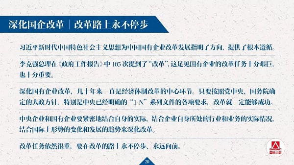 十三屆全國(guó)人大二次會(huì)議新聞中心于3月9日(星期六)15時(shí)在梅地亞中心新聞發(fā)布廳舉行記者會(huì),邀請(qǐng)國(guó)務(wù)院國(guó)資委主任肖亞慶,副主任翁杰明,秘書長(zhǎng)、新聞發(fā)言人彭華崗就“國(guó)有企業(yè)改革發(fā)展”相關(guān)問題回答中外記者提問。本次記者會(huì)內(nèi)容豐富、亮點(diǎn)多多,重點(diǎn)內(nèi)容以20頁P(yáng)PT條分縷析,盡覽國(guó)企國(guó)資改革發(fā)展熱點(diǎn)問題答案。