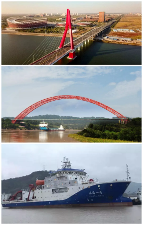 ????上圖所示均為武船集團(tuán)承建的項(xiàng)目。圖1:遼寧盤錦遼濱沿海經(jīng)濟(jì)開發(fā)區(qū)大橋;圖2:四川合江長江一橋;圖3:我國自主研制的第一艘載人潛水器支持母船“深海一號(hào)”。