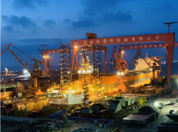 ????3月7日,隨著一艘海上浮式生產(chǎn)儲油船(FPSO)出塢,一艘21萬噸紐卡斯爾型散貨船艏艉、兩個巨型分段同時起浮。標志著備關(guān)注的擁有“中國第一長度船塢”之美譽的中國船舶集團所屬外高橋造船大型郵輪船廠適應(yīng)性改造重點工程——2號船塢改造項目主體結(jié)構(gòu)完工。