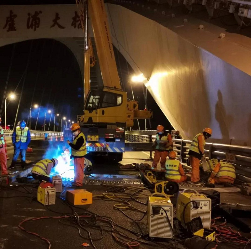 ????此時(shí),來(lái)自中國(guó)船舶集團(tuán)所屬上海盧浦大橋投資發(fā)展有限公司的守橋人開(kāi)工了。近20平方米的施工區(qū)域,人頭攢動(dòng)、焊花飛舞,工人身著的安全背心泛出的熒光,焊槍下閃爍的弧光和橋面的燈光交相輝映。