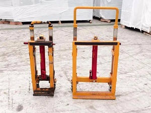 △ 左圖為運(yùn)輸液壓小車,右圖為工人正在操作小車運(yùn)輸。
