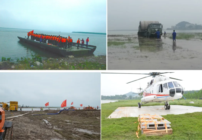 ????在搜救環(huán)節(jié),中船應(yīng)急搶險隊架設(shè)動力舟橋和硬質(zhì)機動路面進行道路搶通,保障重型裝備及人員進場;在內(nèi)澇搶排環(huán)節(jié),采用應(yīng)急泄流虹吸裝備和履帶式排澇機器人參與排澇搶險;在重大險情處置環(huán)節(jié),鋪設(shè)應(yīng)急直升機停機坪保障直升機起降,并實施潰口封堵作業(yè)。