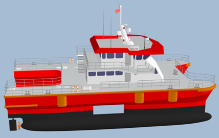 本次簽訂的合同包含兩艘新型單體引航船和一艘雙體引航船。單體引航船總長21.88米、型寬6米、型深2.85米、吃水1.30米,可搭載6名引航員及5名船員,設計航速不小于21.2節(jié)。雙體引航船為國內首創(chuàng),船舶總長27.5米、型寬13.60米、型深5.70米、吃水2.70米,可搭載9名引航員及6名船員,設計航速不小于18節(jié)。