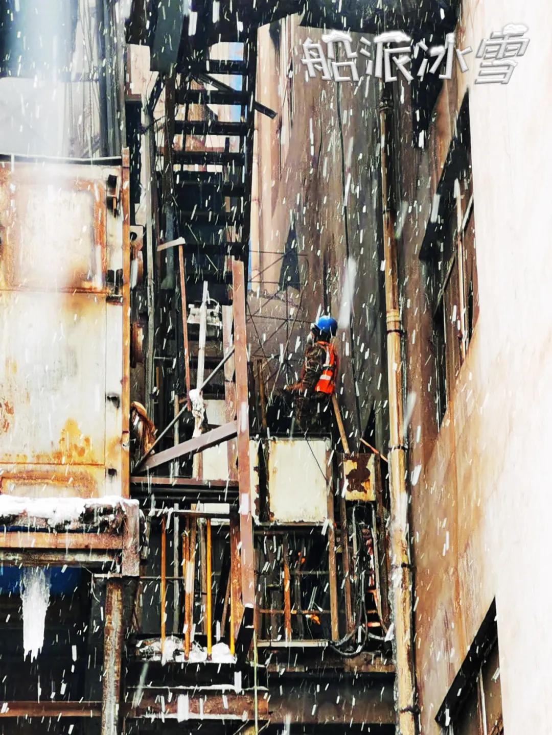 過膝的大雪掩埋了吊車的軌道,渤船小伙抄起“家伙”,為吊車開道,胳膊掄圓,雪花紛飛,別說這畫面還真有點浪漫了。