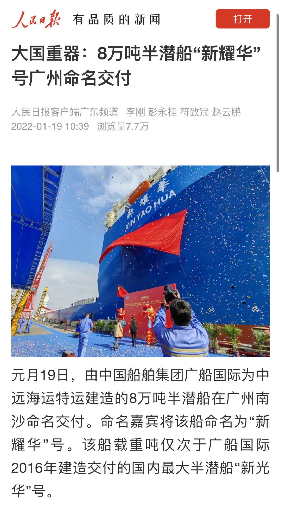 由中國(guó)船舶集團(tuán)建造的這艘8萬噸半潛船取名“新耀華”號(hào),既有不忘歷史之意,更有勇?lián)?zé)任,建設(shè)海洋強(qiáng)國(guó)的美好期盼!