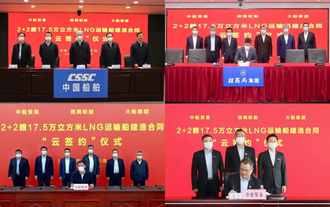 3月31日,中國(guó)船舶集團(tuán)有限公司旗下大船集團(tuán)聯(lián)合中船貿(mào)易與招商局集團(tuán)有限公司旗下招商輪船在上海、深圳、大連及北京四地以“云簽約”方式簽署2+2艘17.5萬(wàn)立方米大型液化天然氣(LNG)運(yùn)輸船建造合同。中國(guó)船舶集團(tuán)黨組書(shū)記、董事長(zhǎng)雷凡培,黨組副書(shū)記、總經(jīng)理?xiàng)罱鸪?,黨組成員、副總經(jīng)理盛紀(jì)綱,招商局集團(tuán)董事長(zhǎng)繆建民、總經(jīng)理胡建華、董事王宏出席簽約儀式。雷凡培、繆建民在儀式上致辭。