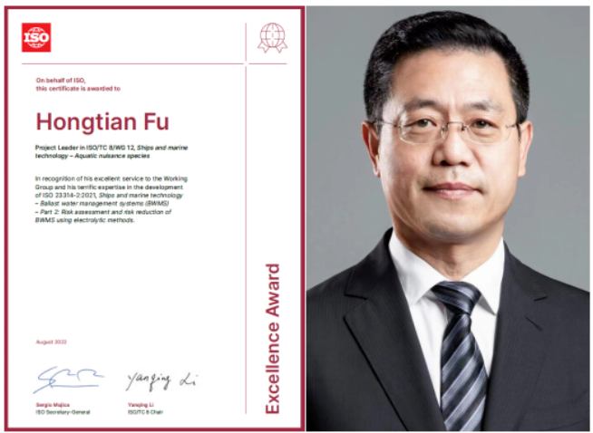 ISO卓越貢獻獎旨在表彰在上一年度ISO國際標準制修訂工作中作出突出貢獻的專家、項目負責人或工作組召集人。此次頒獎表彰了付洪田在ISO 23314-2:2021《船舶與海洋技術(shù)—壓載水管理系統(tǒng)—電解法壓載水管理系統(tǒng)的風險評估與風險降低》國際標準研制作出的貢獻。