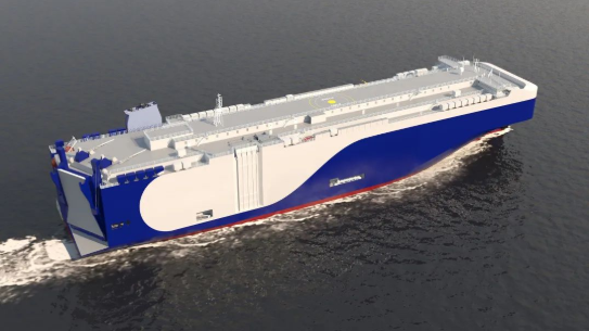 該船型由中國船舶集團(tuán)旗下上海船院設(shè)計(jì),總長200米,型寬38米,裝載能力9000車,可運(yùn)輸電動(dòng)車和常規(guī)燃料汽車以及其他類型的重型滾裝貨物。