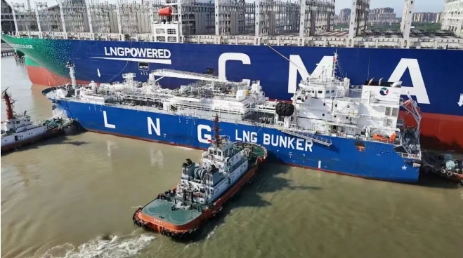 6月20日,全球首款江海直達(dá)型LNG加注船“淮河能源啟航”號(hào)在上海長興島順利完成對(duì)全球首艘23000TEU雙燃料超大型集裝箱船“達(dá)飛 雅克·薩德”號(hào)的LNG燃料補(bǔ)給作業(yè)。這兩艘不同領(lǐng)域的“冠軍”船舶均由中船集團(tuán)旗下滬東中華建造,兩船首次“牽手”,為航運(yùn)業(yè)綠色低碳發(fā)展留下佳話。