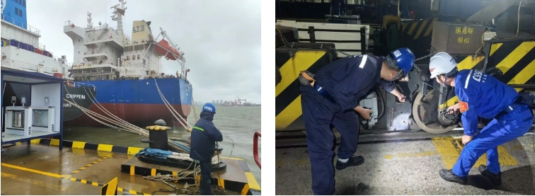 臺(tái)風(fēng)來臨前,聞“風(fēng)”而動(dòng)。緊急為單船加纜,將水上設(shè)備移入港池避風(fēng),拆除全部應(yīng)急梯,對(duì)纜樁開展地毯式排查,預(yù)先部署防臺(tái)橫纜,筑牢前置防線。針對(duì)受風(fēng)面積大的大型集裝箱船等重點(diǎn)產(chǎn)品,升級(jí)加固措施,加裝高強(qiáng)度纜繩等,為巨輪系緊“安全鎖”。