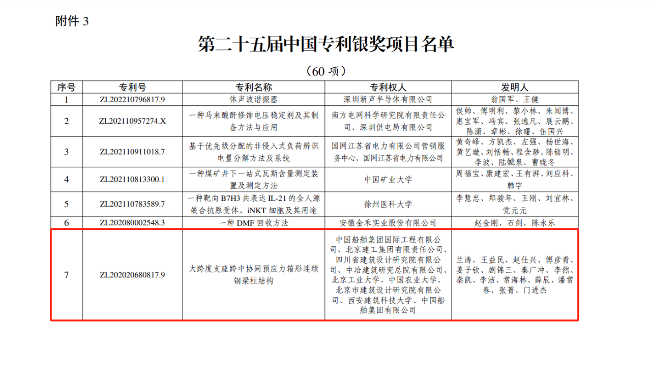 今年6月,國(guó)家知識(shí)產(chǎn)權(quán)局公布第二十五屆中國(guó)專(zhuān)利獎(jiǎng)授獎(jiǎng)決定,由中船集團(tuán)旗下中船國(guó)際工程主導(dǎo)申報(bào)的專(zhuān)利《大跨度支座跨中協(xié)同預(yù)應(yīng)力箱形連續(xù)鋼梁柱結(jié)構(gòu)》(專(zhuān)利號(hào):ZL202020680817.9)榮獲本屆中國(guó)專(zhuān)利銀獎(jiǎng)。該獎(jiǎng)項(xiàng)由國(guó)家知識(shí)產(chǎn)權(quán)局與世界知識(shí)產(chǎn)權(quán)組織聯(lián)合設(shè)立,是我國(guó)專(zhuān)利領(lǐng)域的最高榮譽(yù)。今天,讓我們走進(jìn)中船國(guó)際工程鋼結(jié)構(gòu)工程設(shè)計(jì)與研發(fā)團(tuán)隊(duì),聆聽(tīng)他們的奮斗故事。