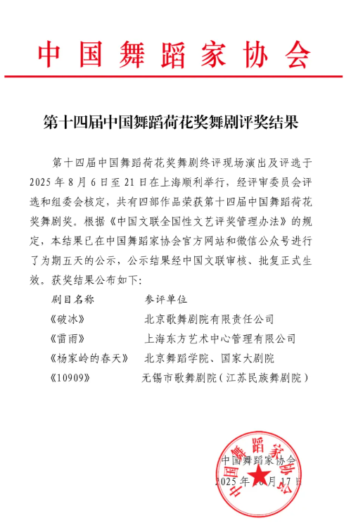近日,第十四屆中國舞蹈荷花獎舞劇獎評選結果揭曉,由無錫市歌舞劇院與中國船舶集團有限公司旗下第七〇二研究所聯(lián)合創(chuàng)作的原創(chuàng)舞劇《10909》從眾多優(yōu)秀作品中脫穎而出,成功摘得荷花獎舞劇獎。