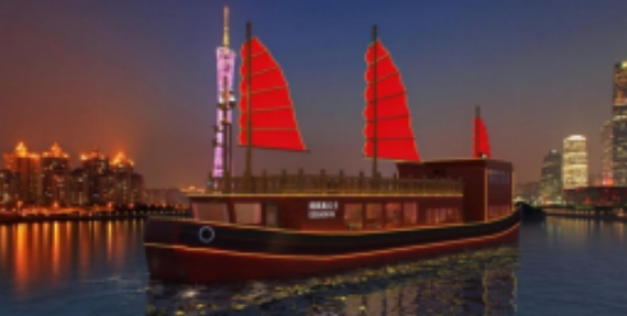????160客位純電動客船“闊闊真公主號”總長36米,型寬8米,型深3米。該船是仿七百多年前元朝闊闊真公主遠(yuǎn)嫁波斯時乘坐的古船建造而成,有“福船送?!钡脑⒁狻=ㄔ旌髮⑿凶哂谥榻?,夜游展示亞洲文化交流的傳奇。