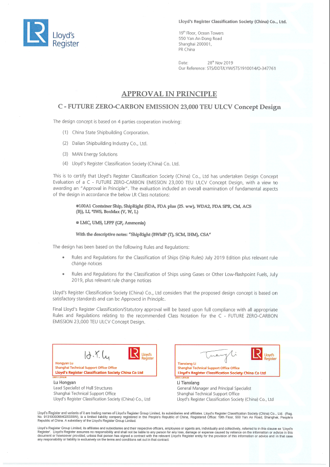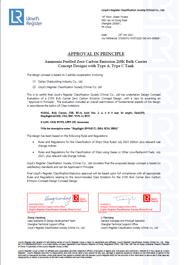 2月25日,中國船舶集團(tuán)旗下大船集團(tuán)最新研發(fā)的液氨動力21萬噸散貨船設(shè)計(jì)方案,獲英國勞氏船級社(LR)原則性認(rèn)可(AIP)證書。