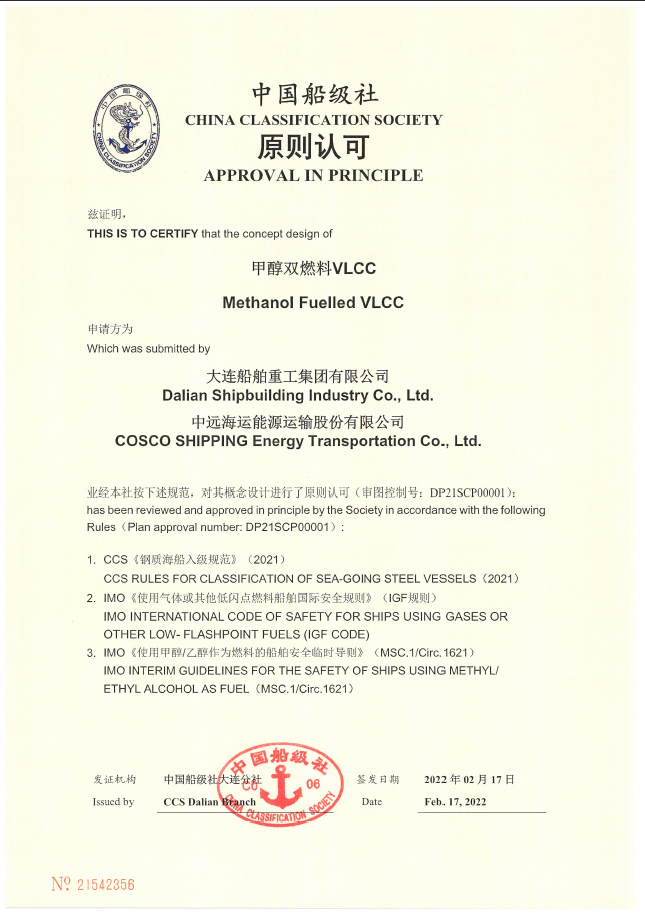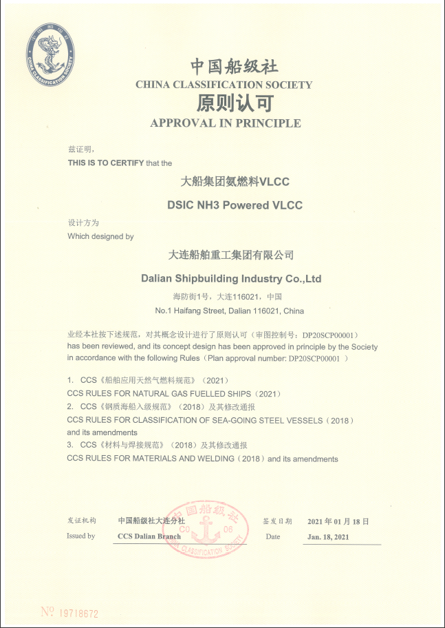 2020年,大船集團(tuán)研發(fā)的液氨動力超大型油船(VLCC)分別取得美國船級社(ABS)和中國船級社(CCS)頒發(fā)的AIP證書。