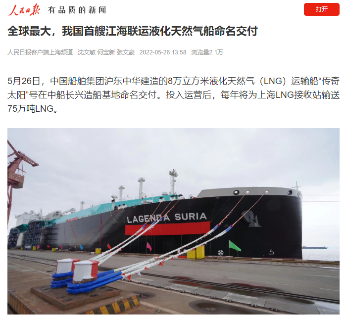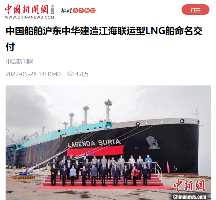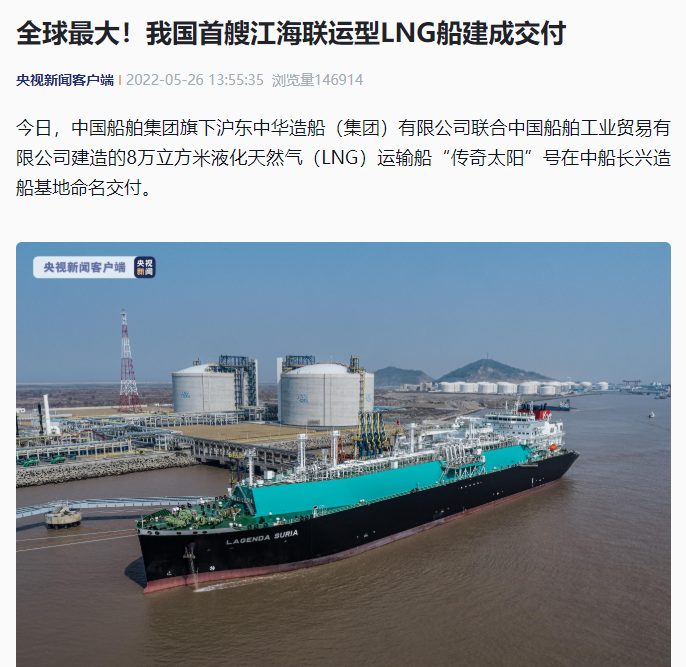 5月26日,中國船舶集團旗下滬東中華聯(lián)合中船貿易建造的8萬立方米液化天然氣(LNG)運輸船“傳奇太陽”號在長興造船基地命名交付?!皞髌嫣枴碧柺侨蜃畲鬁\水航道第四代、我國首款首制首艘江海聯(lián)運型LNG船,填補了中國淺水航道LNG船的空白,在該細分市場占有率最高,有望成為中國船舶制造的又一精品船型。