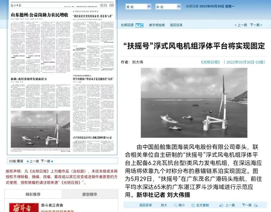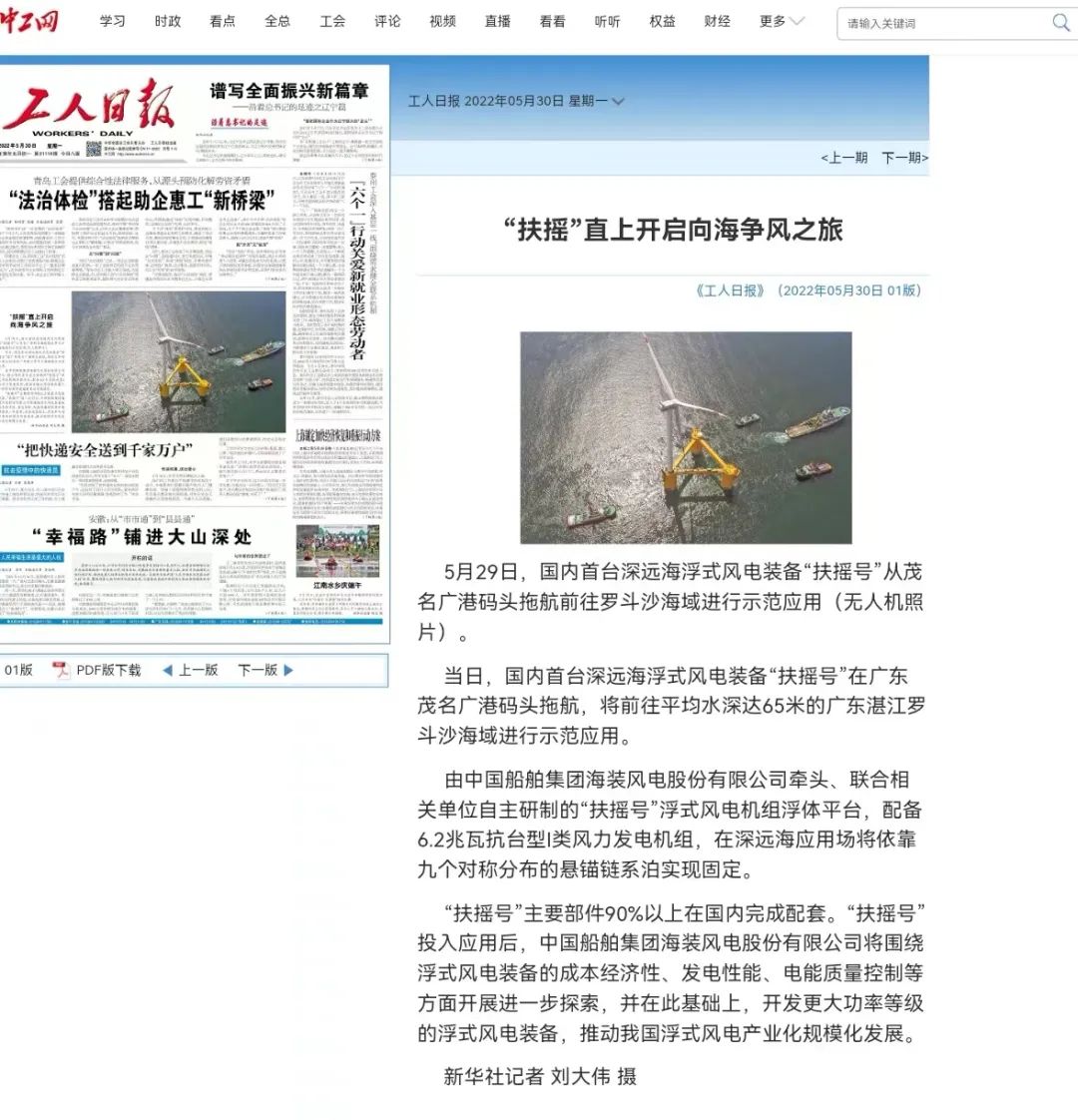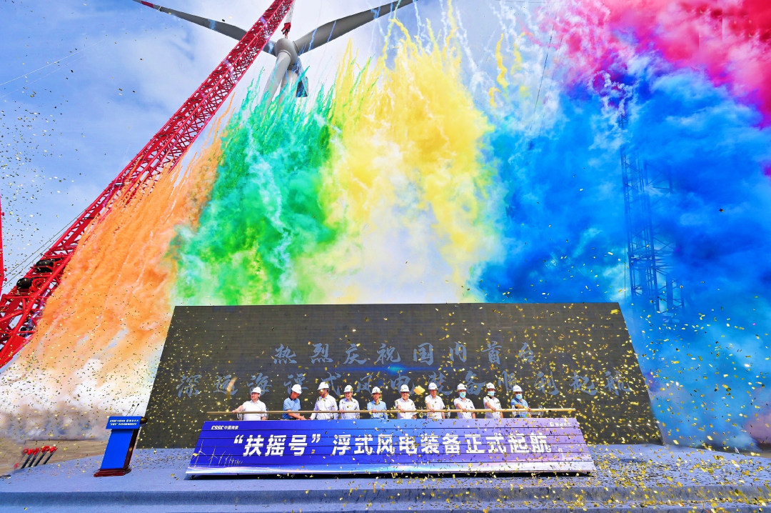 5月29日,中國船舶集團旗下中國海裝牽頭研制的國內(nèi)首臺深遠海浮式風電裝備——“扶搖號”從廣東茂名碼頭起航,前往平均水深65米的廣東湛江附近海域投入示范應(yīng)用。