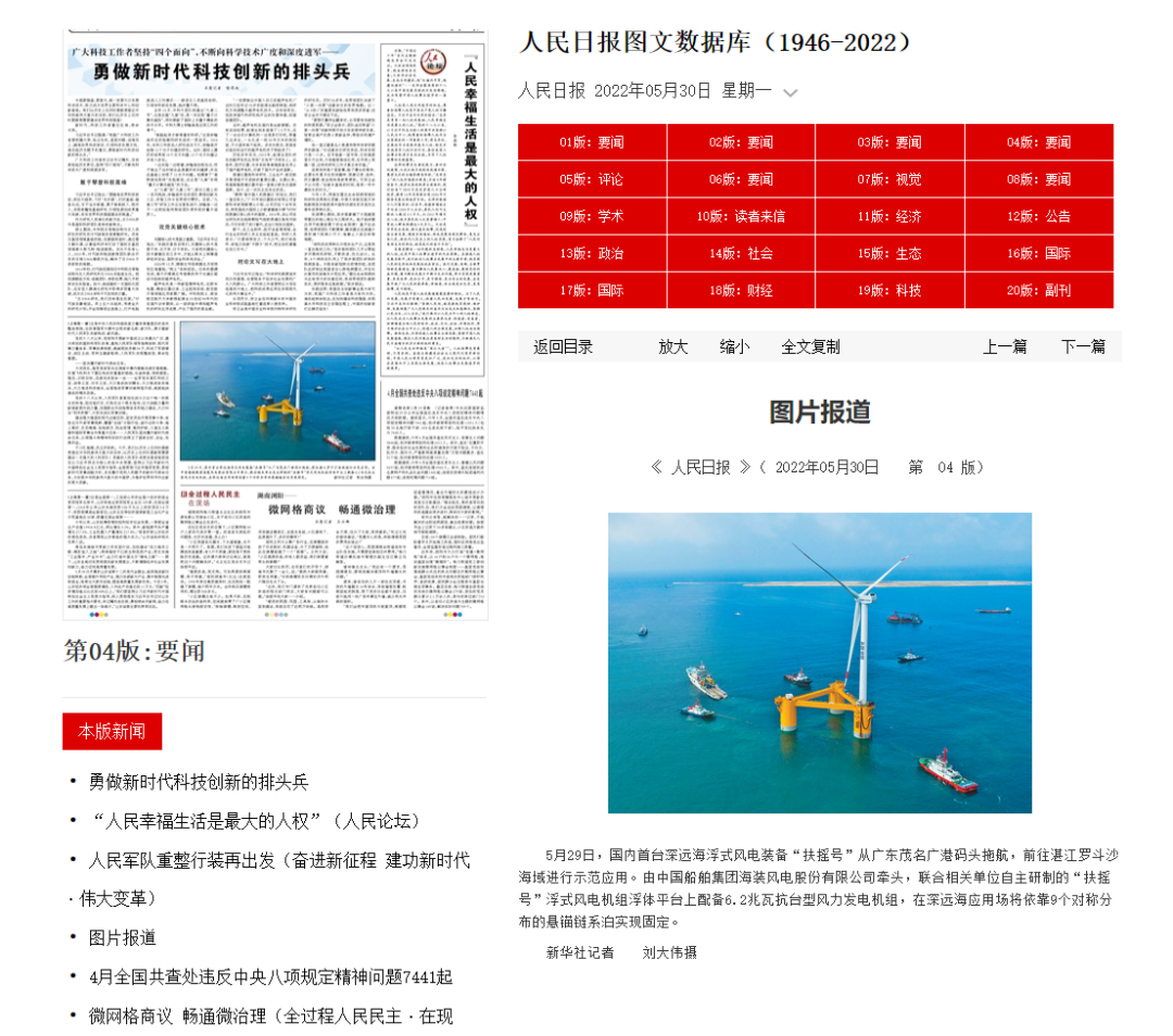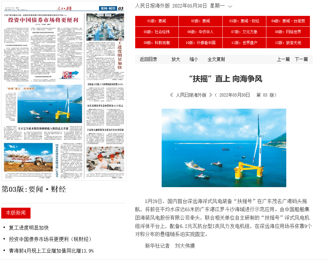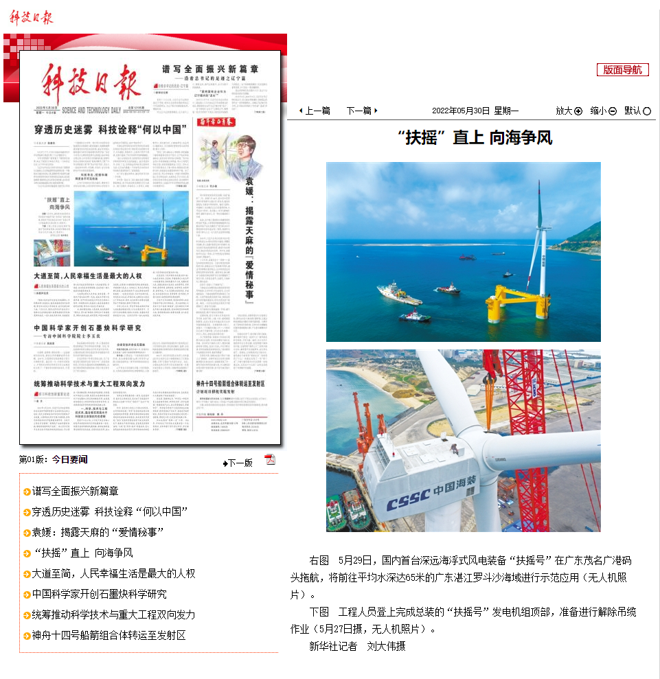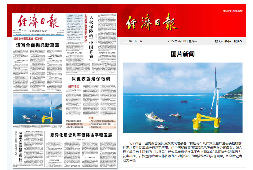 5月29日,中國船舶集團旗下中國海裝牽頭研制的國內(nèi)首臺深遠海浮式風電裝備——“扶搖號”從廣東茂名碼頭起航,前往平均水深65米的廣東湛江附近海域投入示范應(yīng)用。