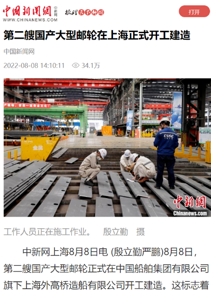 8月8日,第二艘國產(chǎn)大型郵輪在中國船舶集團旗下外高橋造船開建,這標志著中國船舶工業(yè)已初步掌握大型郵輪設計建造關鍵核心技術。