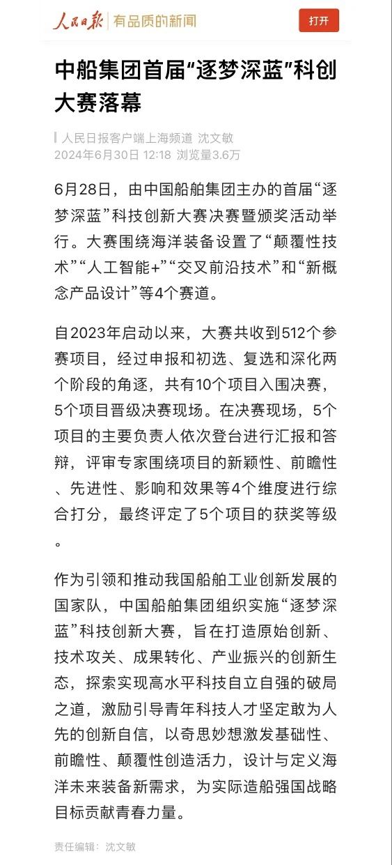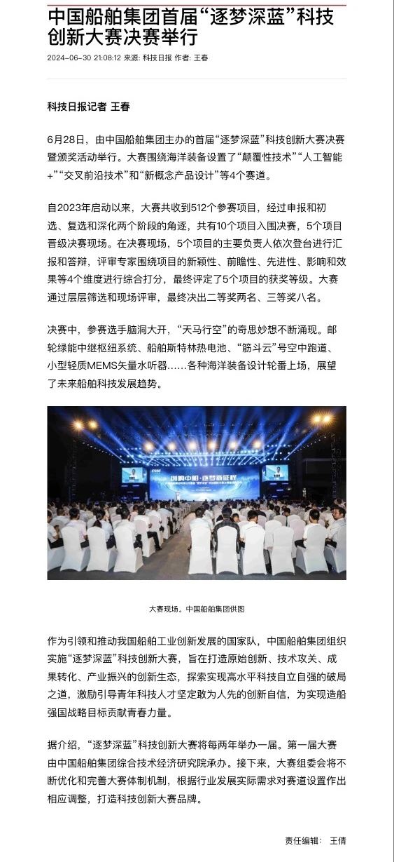 中國船舶集團(tuán)有限公司主辦的首屆“逐夢深藍(lán)”科技創(chuàng)新大賽決賽暨頒獎(jiǎng)活動(dòng)引來各大媒體的關(guān)注,獲得高度評(píng)價(jià)。——>活動(dòng)回顧