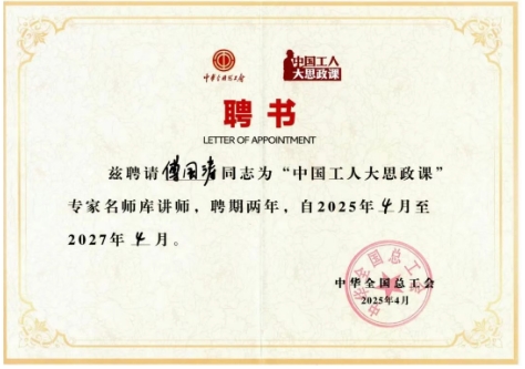 近日,中華全國總工會正式聘請中船集團重慶紅江傅國濤為“中國工人大思政課”專家名師庫講師,聘期兩年。這一聘任旨在推動“大思政課”建設(shè)走深走實,發(fā)揮優(yōu)秀人才在思想政治教育中的示范引領(lǐng)作用。
